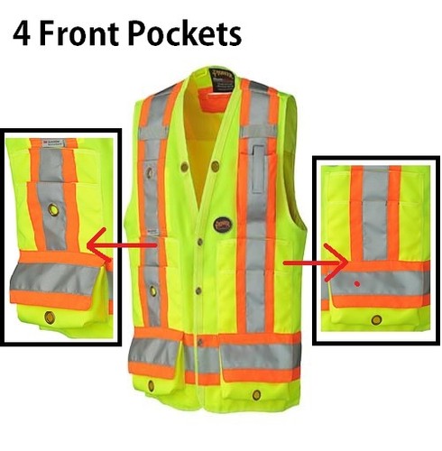 Yellow Safety Vests With 2 Pockets Yellow safety vest with one front pocket, one inside pocket, front velcro closure, and 4 inch reflective orange/ grey tape. Double wall construction with abrasion resistant polyester. Padded belt with leather trim, ... Read Document